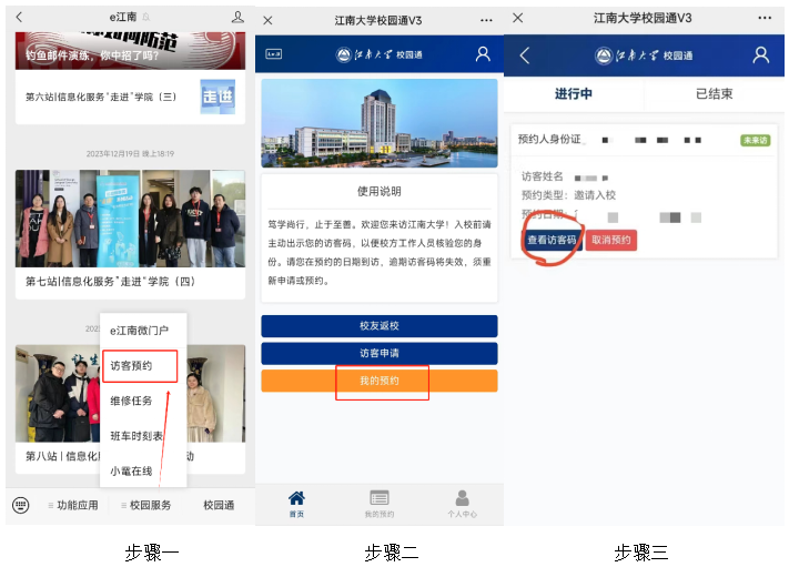 手机关注“e江南”微信公众号,点击屏幕下方“校园服务”中的“访客预约”,进入后点击“我的预约”,点击“查看访客码”即可获得访客码。进入校园时出示访客码。